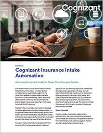 <h3><span class="text-regular">Automate information intake for faster underwriting, claim handling and policy administration.</span></h3> <h5>Document intake is core to the insurance business. Carriers require myriad forms, letters, faxes, emails and other correspondence from a variety of stakeholders to enable functions such as underwriting, claims and policy administration. Until now, document intake has been a largely manual task, requiring in most cases hundreds of staff. </h5> <h5>Cognizant Insurance Intake Automation is designed to help accelerate the information intake process. This software-as-a-service (SaaS) product powers document identification, classification, sorting and routing so business functions have quicker access to the details needed to facilitate decisions.</h5>