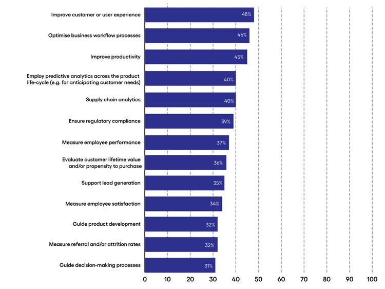 <p><span class="small">Response base: 250 senior insurance executives<br> Source: Economist Impact Survey 2022<br> Figure 2</span></p> <h5><span style="font-weight: normal;">Long way to go</span></h5> <ul> <li><b>New business generation and retention</b>. Just slightly above half of insurers believe tech adoption is significantly benefitting new business generation or retention. This falls well short of data’s potential. Since sales often run through the app or website of a digital retailer, a critical step to maximize this is for insurers to build out an API layer that smoothly integrates their systems with those of these retailers.</li> </ul> <h5><span style="font-weight: normal;">The importance of bridging the gap</span></h5> <ul> <li><b>Being embedded in tech ecosystems is critical to driving future value</b>. Insurers need to be well embedded in dynamic ecosystems through economical API solutions—for example, in partnership with innovative distribution startups.<br> <br> </li> <li><b>Commercial adjacencies and market opportunities emerge through ecosystems. </b>Post-sale relationships with clients can now become ongoing conversations that benefit all sides. For example, subject to customers’ consent, health insurers can use digital channels to nudge them to exercise more and eat healthier food—and then offer lower premiums to those with healthier habits.</li> </ul> <h4>From cognitive customer service to prescient product development</h4> <h5><span style="font-weight: normal;">What they’re good at</span></h5> <ul> <li><b>Customer experience</b>. Advances in technology, best practice adoption across industries, and an emphasis on journey-based engineering have been driving significant experience improvements in insurance. The movement to first understand the human-centric reality of business processes has opened transformational uses of conversational AI, natural language processing, and systems that interact with clients based on underlying emotions. For industry leaders, cognitive systems guide chatbots to respond to customers and escalate work to upskilled agents when tense situations need specialized, human-driven handling. The result is higher customer retention rates, lower agent turnover and the generation of insights to continuously improve customer experience.<br> <br> </li> <li><b>Workflow. </b>New workflows are being put in place so that the most predictable, rote and repetitive activities are handed off to software, while humans specialize in using judgment, creativity and language. Over time, intelligent process automation will improve and will continue to drive engagement specificity where the human touch is needed. </li> </ul> <h4>But insurers are not leveraging data optimally</h4> <p><i>Respondents were asked for which reasons their company is leveraging data. (Percent of respondents who selected each reason)</i><br> </p>
