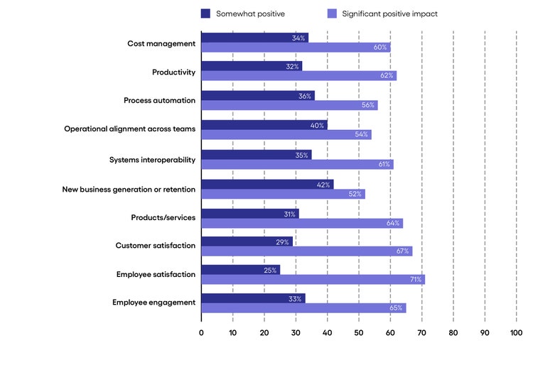 <p><span class="small"><br> Source: Economist Impact Survey 2022<br> Figure 1</span></p> <h5><span style="font-weight: normal;">Long way to go</span></h5> <ul> <li><b>Permissible use of data</b>. Insurers are pondering the digital dimension for applying techniques to improve the use of data, particularly in areas such as risk and rating. Regulation demands increased focus and is driving more and more tech investment (AI/machine learning, big data, etc.) to ensure customer privacy and data protection.</li> </ul> <h5><span style="font-weight: normal;">The importance of bridging the gap</span></h5> <ul> <li><b>Insurance products are changing rapidly as digitization accelerates. </b>From personal auto coverage in which driver behaviors are monitored from mobile phones to renewable energy technology that can be monitored online, the very nature of developing products for the market is evolving rapidly.<br> <br> </li> <li><b>Future regulatory considerations for data. </b>The emerging regulatory scenario will place significant pressure on compliance requirements facing insurers related to data security; consumer protection; and climate-change and environmental impacts.</li> </ul> <h4>From contented employees to connected customers</h4> <h5><span style="font-weight: normal;">What they’re good at</span></h5> <ul> <li><b>Employee satisfaction</b>. Insurers have largely embraced flexibility in areas such as hybrid work and are seeking to make themselves more attractive for tech-savvy and statistically trained talent in a highly competitive job market. Young talent today seeks not just financial rewards, but also purpose at work. Insurers exist precisely to give people security; given their exposure to environment-related risk, they also have a powerful incentive to embrace sustainability.</li> </ul> <h4>Tech adoption is benefiting multiple business areas</h4> <p><i>Respondents were asked what impact their company's technology improvement efforts had on the following business areas over the past year. (Percent of respondents who selected Somewhat positive, or Significant positive impact)</i><br> </p>