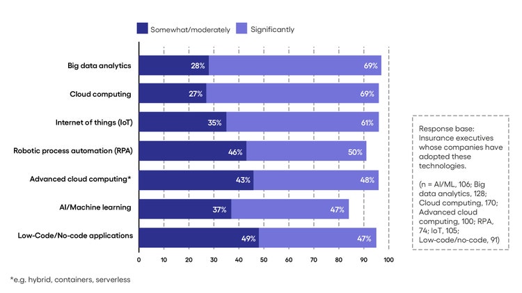 <p>Few industries are as well positioned for the future as insurance. As Economist Impact research commissioned by Cognizant demonstrates, the industry, which was investing heavily in digital even before the pandemic, is full of companies that are recognizing strategic business value from their digital investments.</p> <p>Yet challenges remain. Insurers find themselves beset by niche insurtech competitors that are unencumbered by technical debt; a sometimes-challenging regulatory environment to innovate within; and ever more demanding consumers who insist on shopping, buying, and servicing experiences for complex products at a level akin to a purchase of a new set of earbuds.</p> <p>Here are insights on ways in which the insurance industry is future-ready—and where there is work to be done.</p> <h4>Sustaining the first-mover advantage</h4> <h5><span style="font-weight: normal;">What they’re good at</span></h5> <ul> <li><b>Mastery of data</b>. Insurance is all about data: how it informs the design of products and services, and how it manages customer experience. Insurers are ambitious users of technology and are skillful at linking it to business goals and extracting strategic value from it—this is fundamental to the business. Big data analytics and cloud technology are increasingly being used to handle the massive volumes of data passing through systems and risk engines, searching for insights that lead to differentiation. Almost seven in ten insurance companies that have adopted these two technologies are seeing them deliver significant value. Tech is moving beyond the foundational to the frontier, opening the doors to emerging risks and protection with the promise of predictive analytics and artificial intelligence (AI) contributing to healthier bottom lines and superior customer experience.</li> </ul> <h4>Insurers are deriving significant strategic value from tech investments</h4> <p><em>Respondents were asked to what extent the following technologies and methodologies already adopted by their business are delivering strategic value to their operations. (Percentage of respondents who advised each technology is, or is not, providing significant value to their business)</em><br> </p>