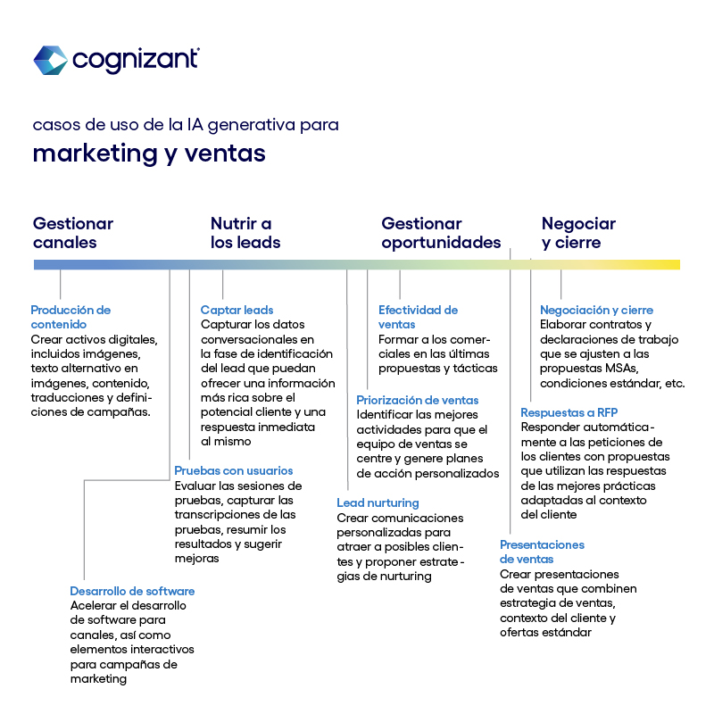 Desde la transformación de la experiencia del cliente y la potenciación del marketing y las ventas hasta la mejora de la experiencia de los empleados, estos impactantes casos de uso canalizan las fortalezas de la GenAI en resultados tangibles para el negocio.