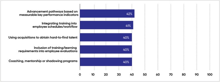 <p><span class="small">Response base: 250 senior manufacturing executives <br> Source: Economist Impact Survey 2022<br> Fig 2</span></p> <h5>What they're good at</h5> <ul> <li><b>Providing a digital career path. </b>There’s no doubt that<b> </b>the skillsets required for modern manufacturing are becoming more digital. Manufacturers have recognized that providing career progression and advancement is the best way to retain and cultivate digital talent in a hyper-competitive market.</li> </ul> <h5>Long way to go</h5> <ul> <li><b>Leveraging institutional knowledge. </b>While 93% of respondents agree that talent readiness is very important to future readiness, fewer than half are taking action on talent management strategies. If advancement pathways are not in place and training is not provided, it will be easier than ever for employees to take their skills into other industries.<br> <br> Moreover, employees with institutional knowledge aren’t being sufficiently leveraged; only 39% of respondents are implementing coaching and mentorship programs.</li> </ul> <h5>The importance of bridging the gap</h5> <ul> <li><b>Promoting an industry of opportunity. </b>Manufacturing is a tech-heavy industry, but it must better leverage its advantages in this space to change the perception of the industry. While the sector has long struggled to woo digital talent, manufacturers can attract skilled workers by promoting its investment in technology, efforts toward data monetization and focus on sustainability.</li> </ul> <h4>ESG: beyond regulatory requirements</h4> <p><i>Respondents were asked to identify actions their organization were taking to improve their environmental sustainability and social impact. (Percent of respondents selecting each measure)</i></p>