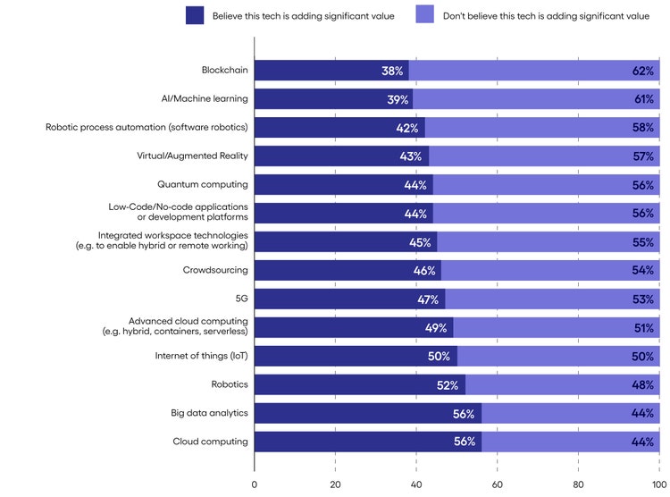 <p>After two years of pandemic-induced digital investment, companies are now seeking to convert their digital transformation efforts into being <a href="/content/dam/connectedassets/cognizant-global-marketing/marketing-channels/cognizant-dotcom/en_us/insights/documents/ready-for-anything-what-it-means-to-be-a-modern-business-wf1189596.pdf" target="_blank">ready for anything</a>. But while business leaders are convinced technology is key to preparing for the future, according to a recent Economist Impact study supported by Cognizant, respondents seem less interested in what it will take to unlock the full potential of that technology: an engaged and digital-first workforce.</p> <p>This oversight is a likely contributor to hampered returns on digital investments. Figure 1 shows that even core technologies such as cloud computing fail to deliver significant value to nearly half of businesses. It’s simplistic to suggest the cause is solely a failure to adequately invest in training, skills development and the overall employee experience. Yet the imbalance between investment in tech and in people is certainly a contributing factor.</p> <h4>Technology’s potential stunted by under-investment in talent</h4> <p><i>Respondents were asked to what extent the following technologies and methodologies already adopted by their business are delivering strategic value to their operations. (Percentage of respondents who advised each technology is, or is not, providing significant value to their business)</i></p>