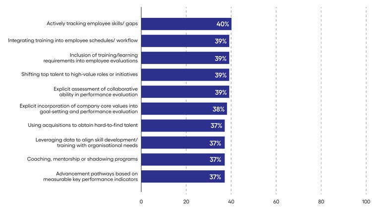 <p><span class="small">Response base: 2,000 senior leaders<br> Source: Economist Impact Survey 2022<br> Figure 3</span></p> <p>The fact is, employee engagement is increasingly important to every business, if only from a cost and productivity perspective. <a href="https://www.gallup.com/workplace/351545/great-resignation-really-great-discontent.aspx" target="_blank" rel="noopener noreferrer">Gallup estimates</a> that disengaged employees—which it says includes two-thirds of the global workforce—cost their companies the equivalent of 18% of their annual salaries. It also estimates that disengaged employees cost the UK alone £52 billion to £70 billion in lost productivity—per year.</p> <p>Forward-thinking companies are beginning to address both skills gaps and employee engagement within their workforces:</p> <ul> <li>Verizon offers a free upskilling program, <a href="https://www.verizon.com/about/responsibility/human-prosperity/reskilling-program" target="_blank" rel="noopener noreferrer">Skill Forward</a>, that provides an on-ramp to multiple tech career pathways for people in several US cities.<br> <br> </li> <li>Google partners with Jobs for the Future to train low-income adults and prepare the next generation of workers for IT careers through its <a href="https://www.jff.org/what-we-do/impact-stories/grow-google/" target="_blank" rel="noopener noreferrer">IT Support Professional Certificate</a>.<br> <br> </li> <li>Walmart provides its associates with free access to higher education and skills training through its <a href="https://corporate.walmart.com/newsroom/2021/07/27/walmart-to-pay-100-of-college-tuition-and-books-for-associates" target="_blank" rel="noopener noreferrer">Live Better U</a> education program.</li> </ul> <p>There is also an array of smaller endeavors that leaders can prioritize to prepare the work environment for employee success. However, the study reveals that talent cultivation efforts are sporadic in most enterprises. At most, any single initiative of the 10 presented in the survey is in place for just 40% of companies (see Figure 4).</p> <h4>Sparse use of workforce enhancement practices</h4> <p><i>Respondents were asked which of the following initiatives to support talent cultivation they have implemented in their company. (Percentage of respondents who selecting each topic)</i><br> </p>