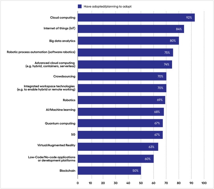 <p>Utilities face a whirlwind of change, including shifting regulations and evolving consumer demands. But it is energy transition—the ongoing process of replacing fossil fuels with low-carbon sources—that continues to drive the industry, with fully modernized smart grids on the supply side and retailers rapidly digitizing customer touchpoints. </p> <p>Moreover, the rise in distributed energy resources (DERs)—energy generation units often owned by consumers, such as rooftop solar panels—will fundamentally transform energy markets and utility operations. In some cases, this presents an existential threat to utility companies that fail to keep pace if consumers elect to self-generate electricity and bypass utility companies entirely. </p> <p>Experimenting with and deploying advanced and emerging technologies can be risky for an industry whose top goal is to keep power on everywhere. But it’s only by keeping up with or staying ahead of this evolving market trend that utilities, regulators and customers can reap the full range of benefits available through a more distributed energy system.</p> <p>Economist Impact Group research supported by Cognizant identifies the pain points the utilities industry is experiencing in a tumultuous and competitive market. Future-readiness lies in the connection points between the major investments now taking place: renewable and distributed energy sources, digital technology and the customer experience.</p> <p>It’s vital, then, for the utilities industry to proactively plan and invest in digital systems, an effective workforce and the business processes needed to accommodate a large amount of new distributed energy resources. This shift brings new challenges to the traditional pace and approach of the sector. </p> <p>Within the industry, leaders have begun to develop new skillsets and disciplines across their companies. Installing leaders from other industries to modernize workspaces is one indicator of the subtle cultural change taking hold. </p> <p>Leaders are also looking to create future success by harnessing data to make informed decisions, capturing and leveraging institutional knowledge, adopting business model innovation, and investing in the employee experience—in some cases looking to monetize data where feasible.</p> <h4>Proven tech tops the digital shopping list</h4> <p><i><span class="text-regular-italic">Respondents were asked to identify the technologies and methodologies their business has adopted or is planning to adopt in the next two years. (Percent of respondents who have adopted or plan to adopt)</span></i><br> </p>