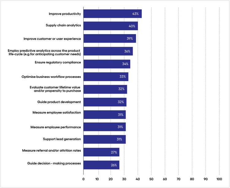 <p><span class="small">Response base: 250 senior utilities executives<br> Source: Economist Impact Survey 2022<br> Fig 1</span></p> <h5>What they're good at </h5> <ul> <li><b>Reducing risk and supporting critical operations.</b> With hyper-customized legacy systems dedicated to customer services and asset management, utilities are now focused on modernizing core technology to reduce risk and ensure ongoing quality of service.<br> <br> Executives say they’re adopting cloud computing (92%), Internet of Things (84%) and big data analytics (80%). The growing need to connect smart grids to customer systems is reflected in the critical need for cybersecurity to safeguard power supply.<br> <br> In most cases, though, these systems are incapable of supporting now-critical customer demands and regulatory requirements—such as new rate structures and communication channels. Utilities will need to consider deploying front-end customer relationship management systems (CRM) with other information systems to adapt to increasing customer demands and an evolving energy marketplace.</li> </ul> <h5>Long way to go<br> </h5> <ul> <li><b>Change management needs to be prioritized.</b> The willingness and intent to invest in technology is formidable, but when large implementation projects get unwieldy and begin to run over established timelines, budgets and scope, the tendency is for skills and capability planning to be neglected.<br> <br> Leaders share stories of implementing new technology only to see technicians and engineers using stand-alone spreadsheets and other habit-fueled tactics to complete and log daily activities. Worse still, many of these workarounds are kept offline, which limits knowledge transfer.</li> </ul> <h5>The importance of bridging the gap<br> </h5> <ul> <li><b>Fully operationalizing technology yields true business value.</b> Moving beyond an IT infrastructure and systems strategy that hinges solely on regulatory compliance or latent customer demands is still a work in progress. To pivot to long-term strategic investments in processes and people, utilities need to update their business case methodologies and key performance indicators (KPIs) to include activities that support technology operationalization.<br> <br> It's when resources are dedicated to process change and tech is integrated into the human experience at work that the full value of advanced and emerging technologies can be realized.</li> </ul> <h4>Utilities chase productivity and supply chain insights</h4> <p><i><span class="text-regular-italic">Respondents were asked in which areas their company is leveraging data. (Percent of respondents using data in each area)</span></i><br> </p>